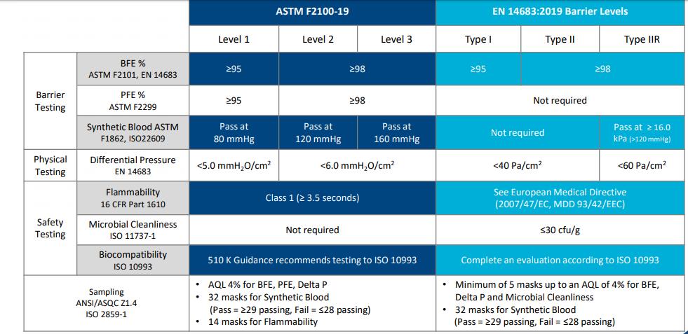歐洲 EN14683 跟 ASTM 相同,但就更著重測量 BFE 以及壓力差,但就沒有量度 PFE。